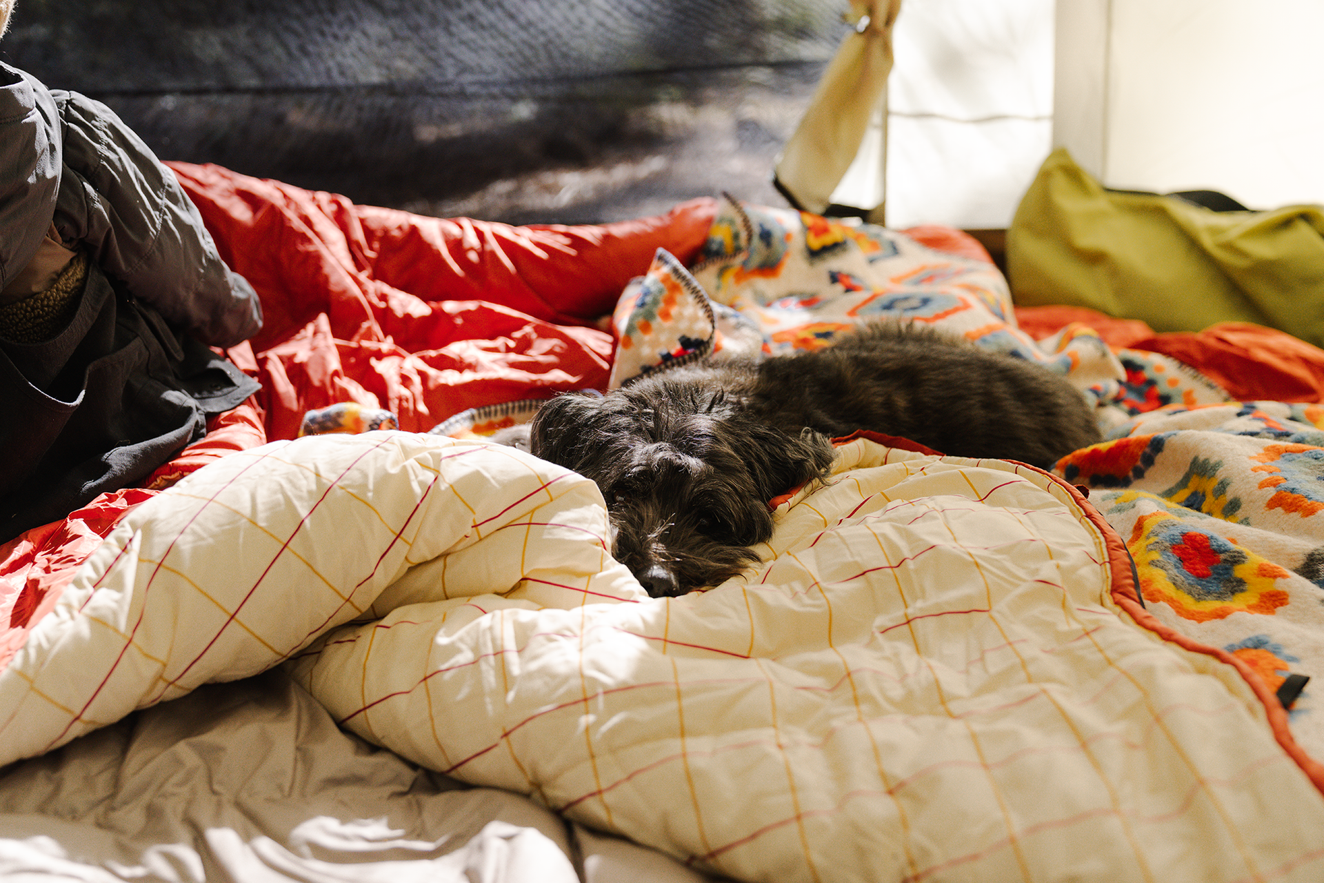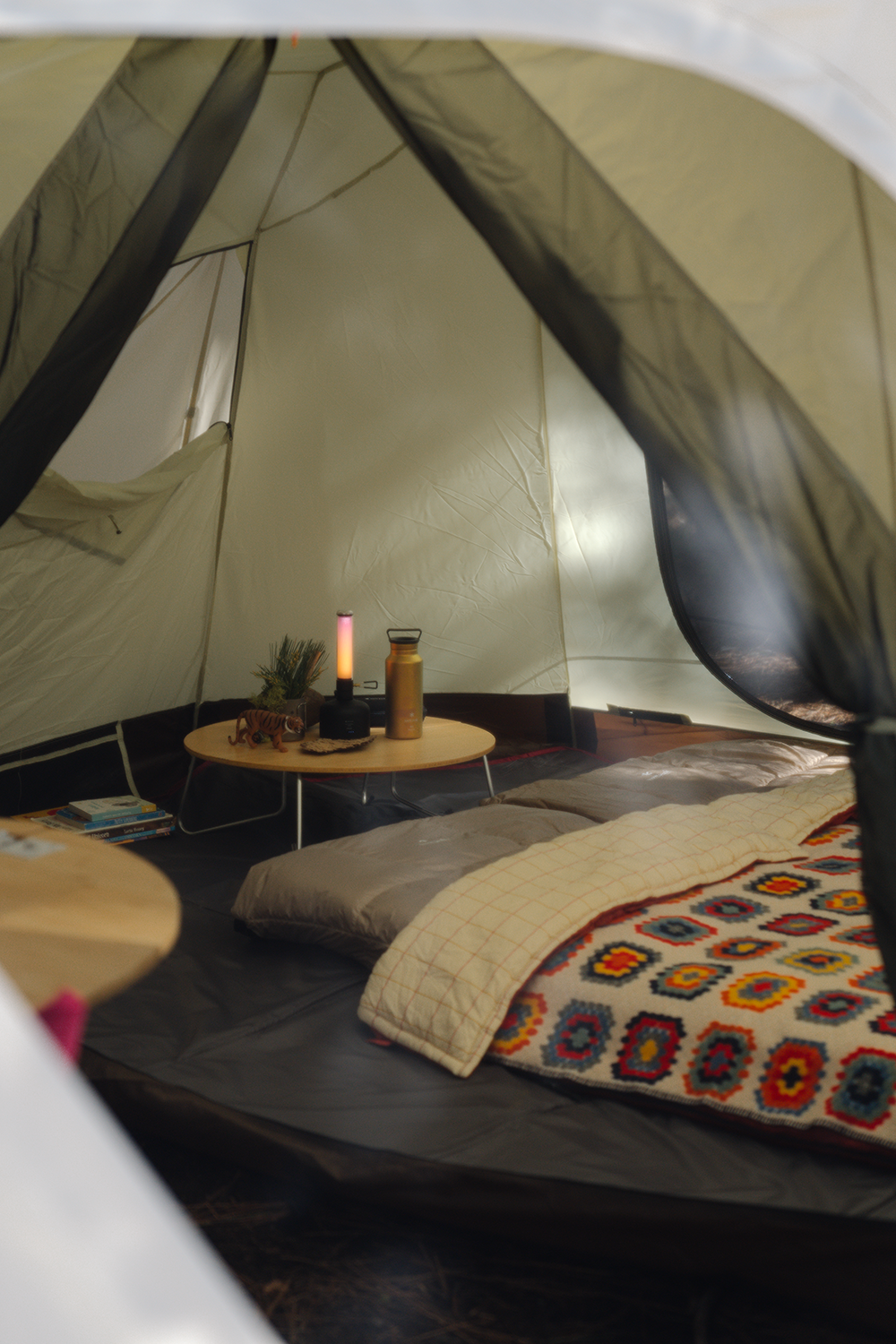 Make yourself feel at home by adding some extras to your space. A low table for a book or lantern can further a true bedroom-style experience. Simple ground-style seating offers another option for lounging. Finally the addition of a cosy glow from your favourite camping light can set the mood for a restful night's sleep. Finally, it's also worth trying to keep the sleeping area wet and mud-free by taking off shoes or drying feet before you go into that space - although that might be difficult to explain to your four-legged friend who will no doubt want to be cosy too...