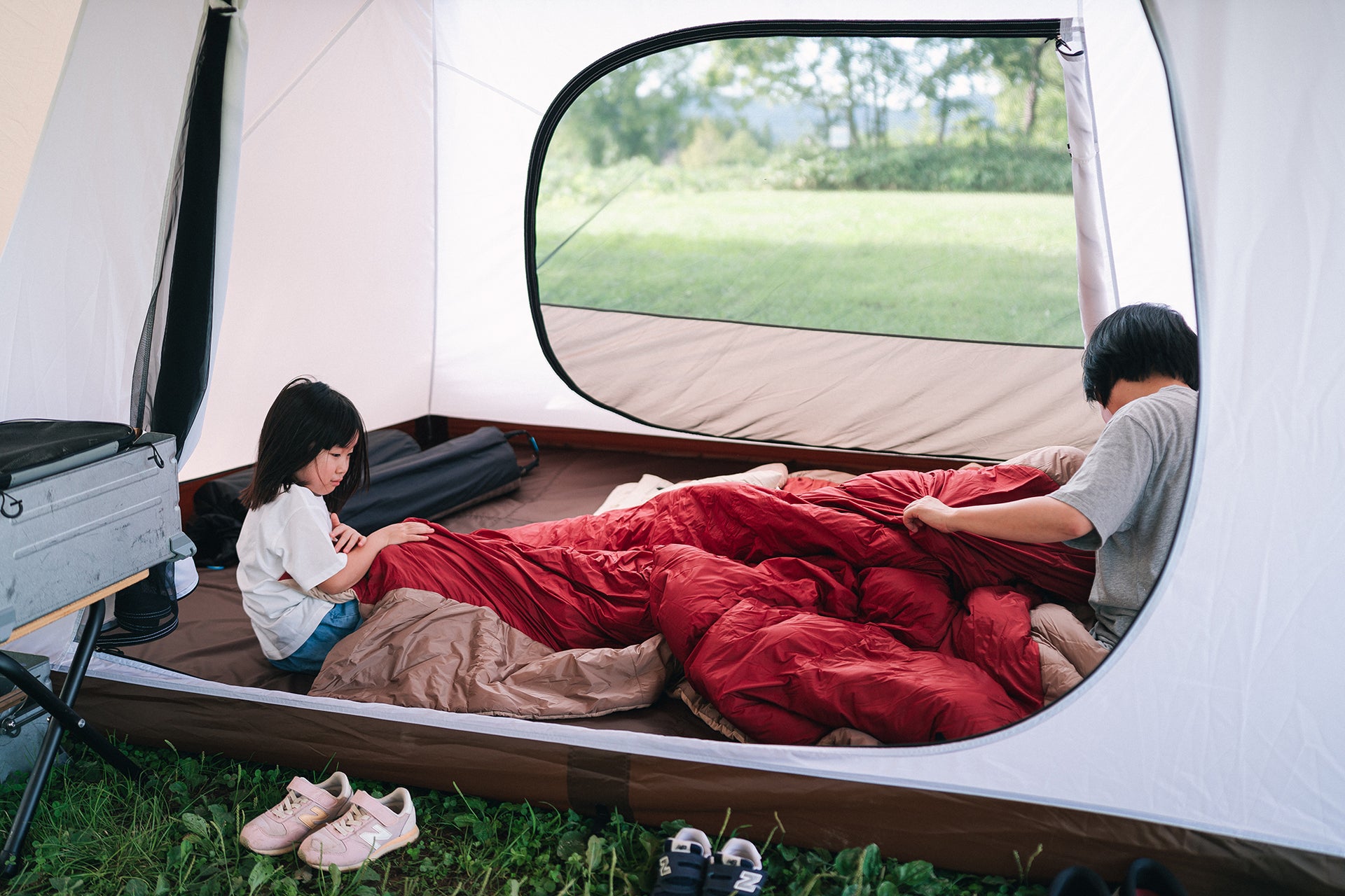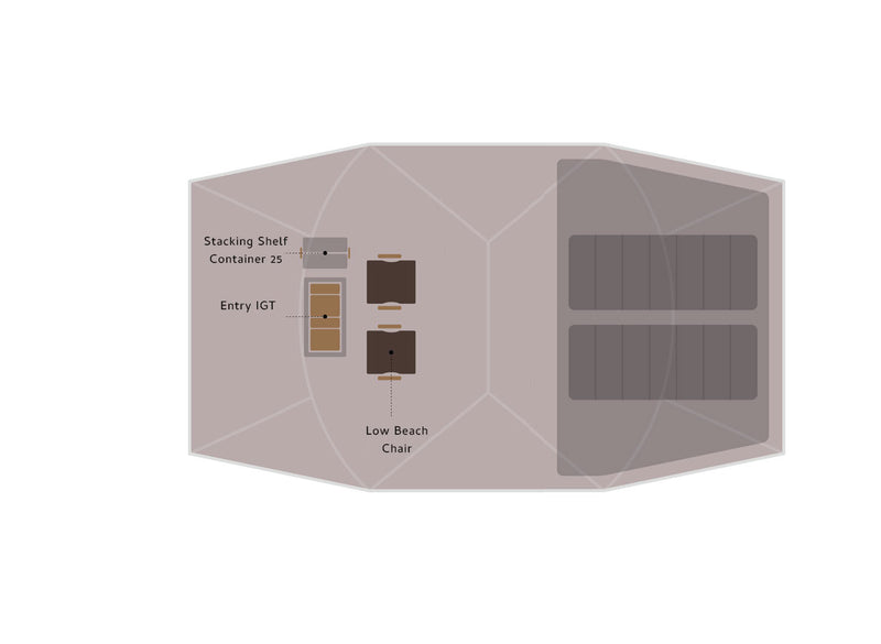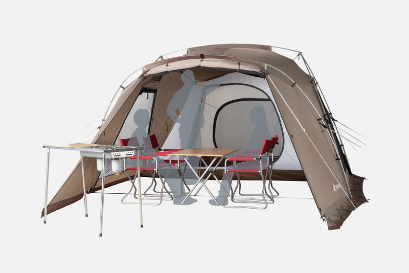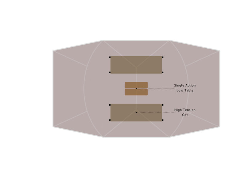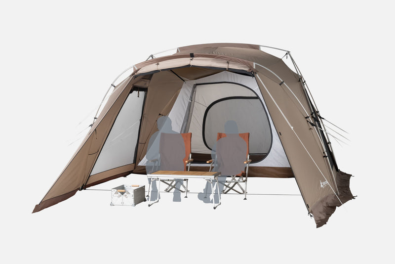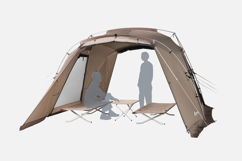 Set up here as a day camp space, two cots can easily fit with plenty of room for a table or anything else you may need. Spacious enough to allow for a relaxing nap, protecting you and your possessions from the sun or rain.