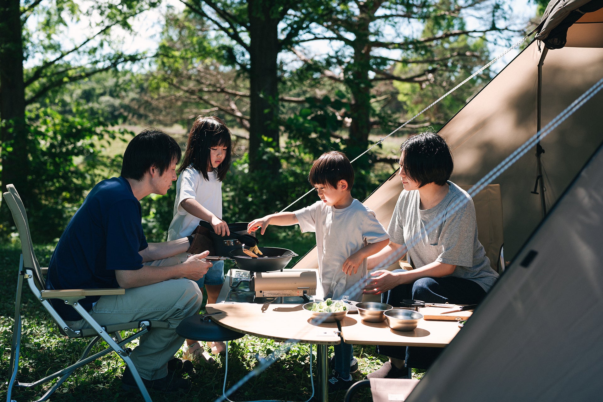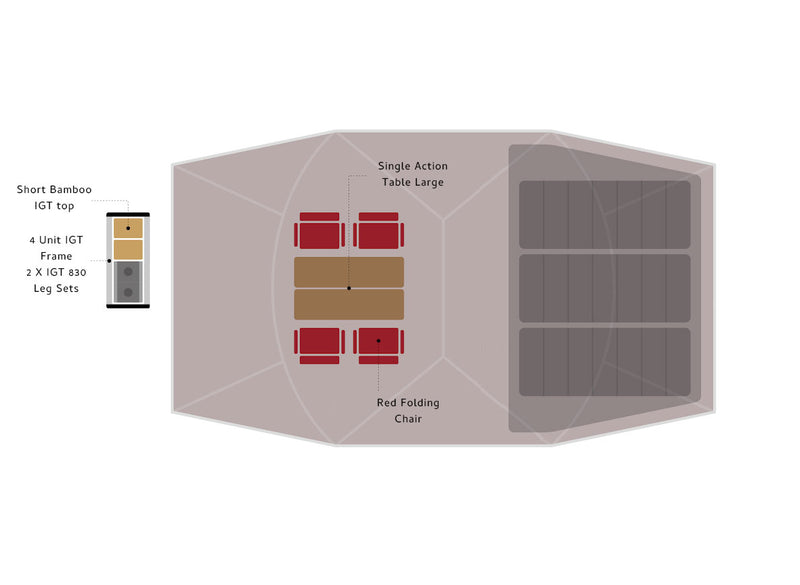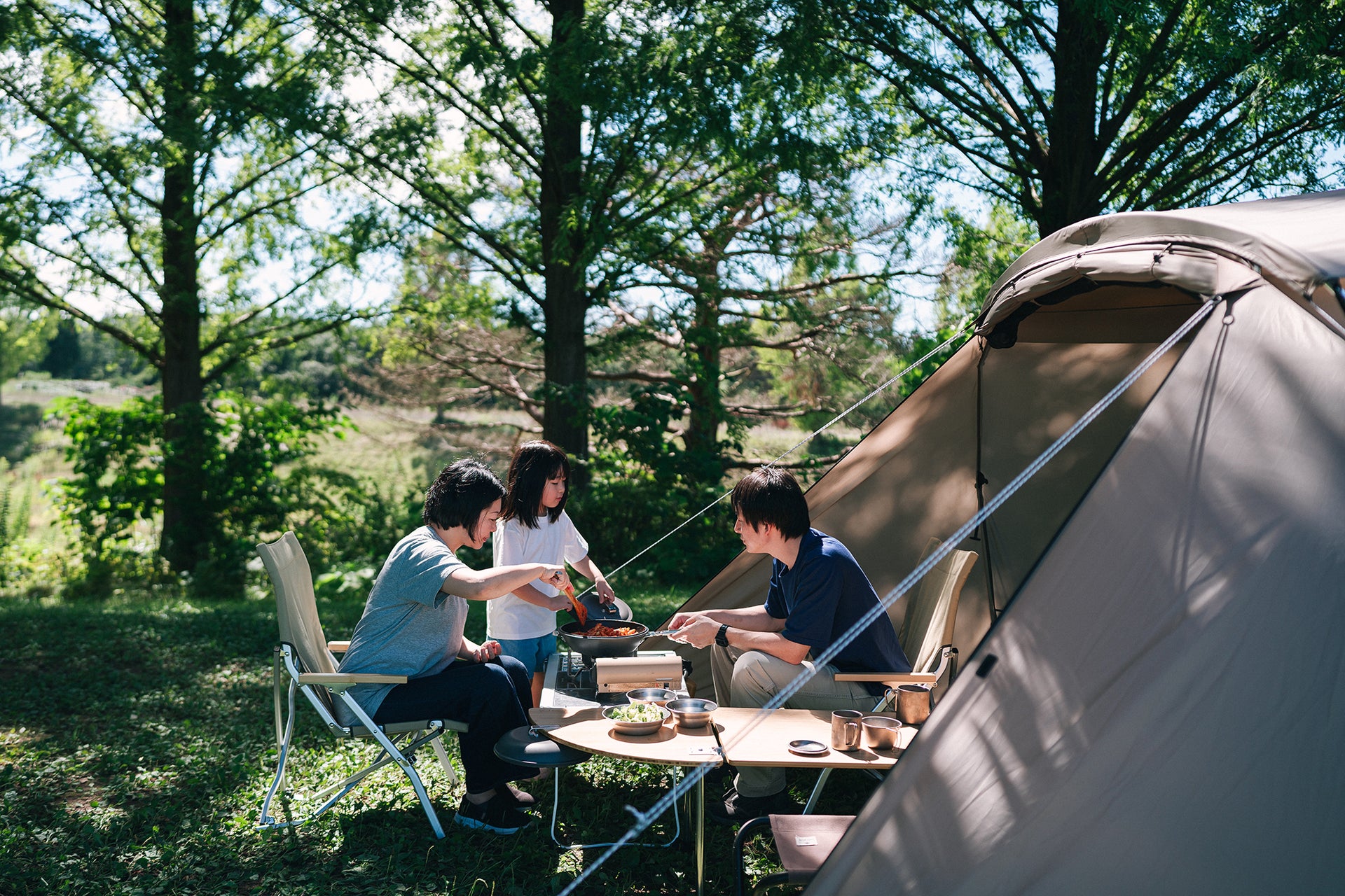 A luxurious setup for a couple, set up here with our low-style furniture, allowing you to enjoy the view and have a relaxed meal. This layout allows for ample space, perfect for those camping with a dog.